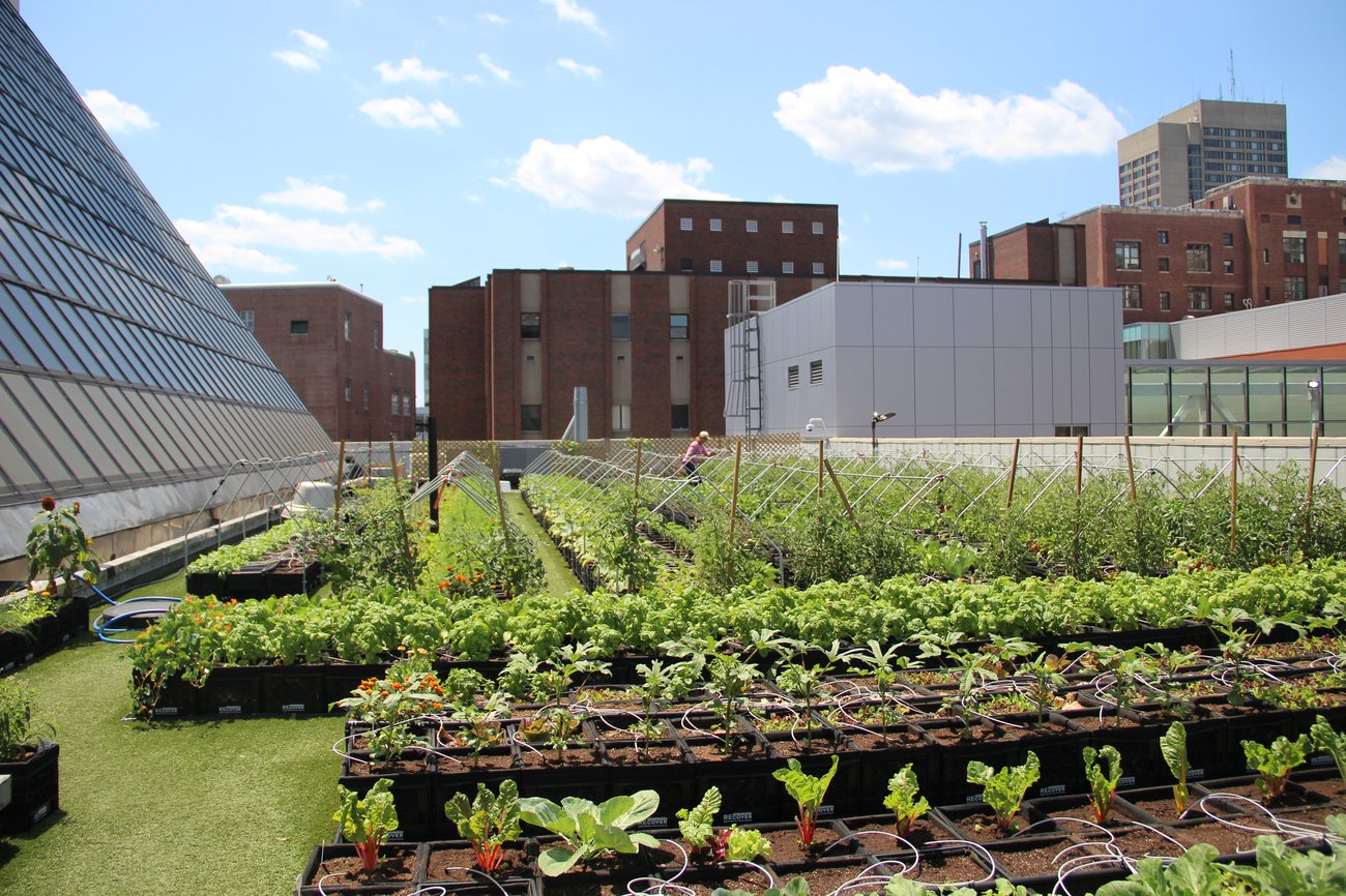 Sou twazyèm etaj la, sou fèm nou an ki mezire 2,658 pye kare, nou kiltive gwo rekòt, tankou radi, piman, ak legim vèt. Non sèlman fèm nan pwodui plis pase 4,000 liv manje fre chak ane pou pasyan nou yo, men tou li bon pou anviwònman an lè li diminye kantite dlo lapli ki tonbe atè a ak itilizasyon enèji. "Nou vle fè Boston popilasyon nan vil ki plis an sante nan mond lan," deklarasyon David Maffeo, direktè prensipal, ki te vini ak lide pou fèm nan an 2017. |